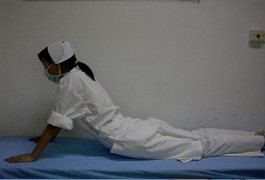 即:俯卧在床上,以腹部为支撑点,抬头、挺胸,同时抬起大腿、小腿与足,让头部和腿部同时翘起来,形似燕子飞一样。