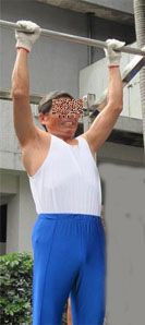 有两点需要留意:(1)“单杠”不要架得太高,站着,手能抓得到(的高度)就行。如果架得太高,操作时需跳上跳下,这本身对椎间盘有冲击作用,加重其“突出”。(2)抓吊单杠时,将双小腿向后抬起,尽量挺胸挺腰。也就是说,要顺着腰椎原有的弯曲线牵引。